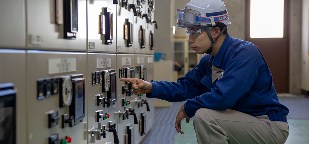 千葉工場は北地区、南地区、タンクヤード、甲子地区と分かれており、敷地の総面積が731,020㎡とスケールがとても大きく、エチレンプラントを2基保有しています。間接部門と製造部署があり、約700名の社員が千葉工場・事務所で働いています。