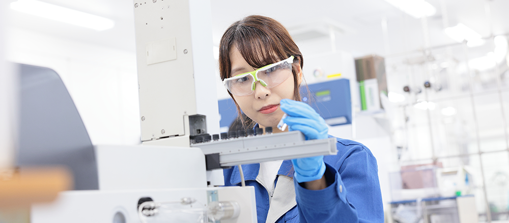 開発センターでは、エチレンやプロピレンといった基礎化学品に、研究開発によって高付加価値化を行いメチルエチルケトンやパラビニルフェノール樹脂、ビニルエーテルといった丸善石油化学にしかない高性能な製品を生み出しています。